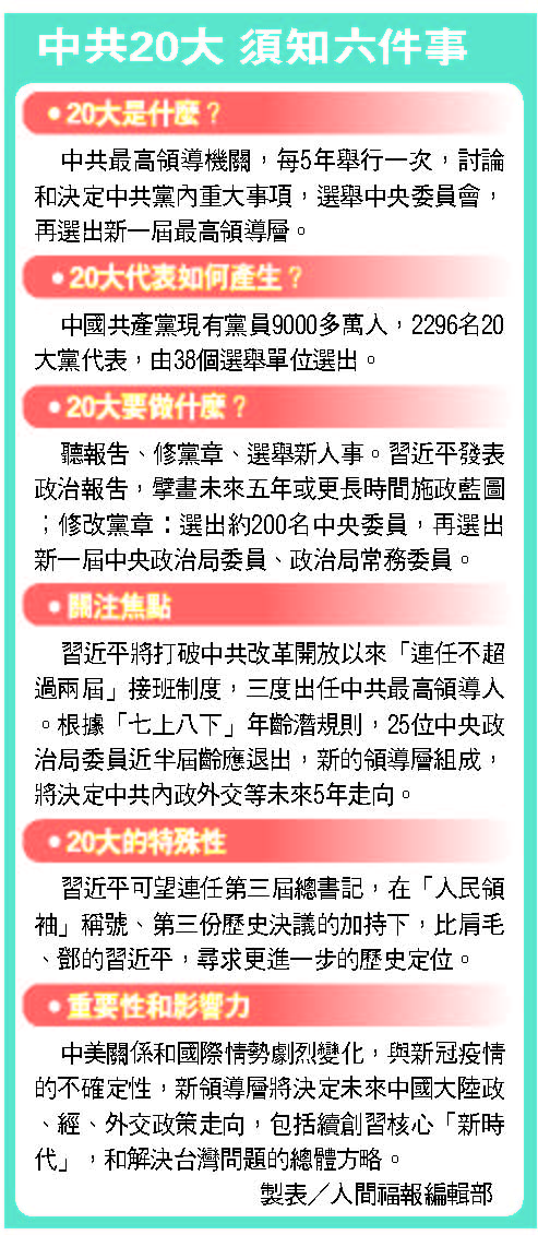 【本報綜合報導】中共20大16日上午開幕,中共20大新聞發言人孫業禮15日傍晚舉行記者會表示,在15日下午召開中共20大預備會議已確定大會議程,並通過大會主席團名單以及由王滬寧擔任大會祕書長,外界預期中國國家主席習近平將邁向第3任。