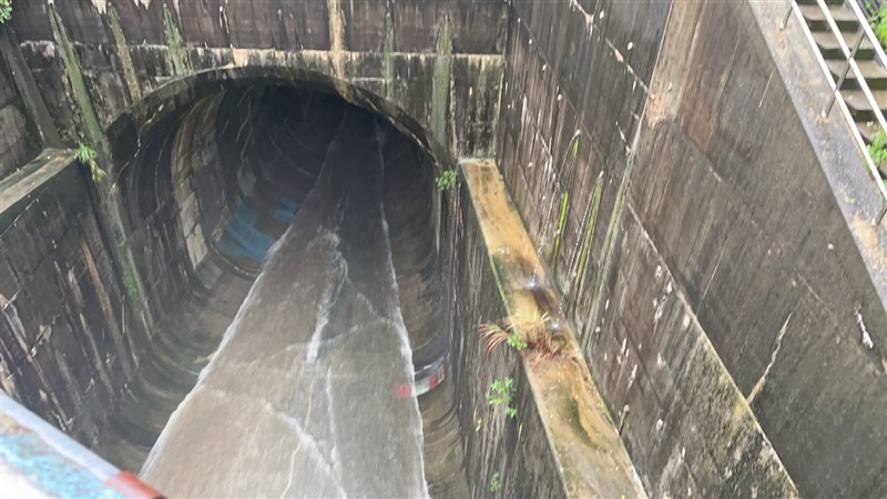 十河局說,員山子攔河堰昨天淩晨0點10分達警戒水位62.5公尺,洪水越過側流堰進入分洪靜水池。今天上午7點30分水位超過63公尺,洪水經由分洪堰進入隧道開始分洪。