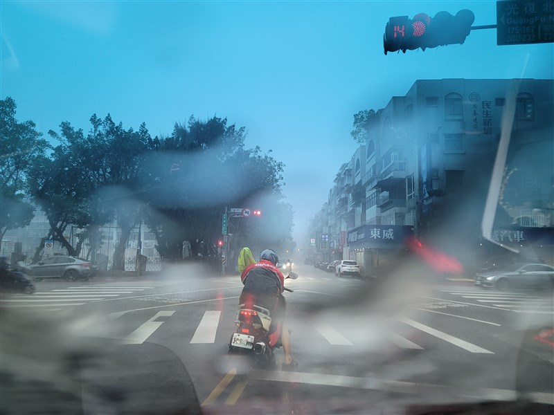 尼莎颱風「共伴效應還沒完」,北部仍會有大雨發生。圖為16日騎士在暴雨中維持平衡。圖/記者張睿杰