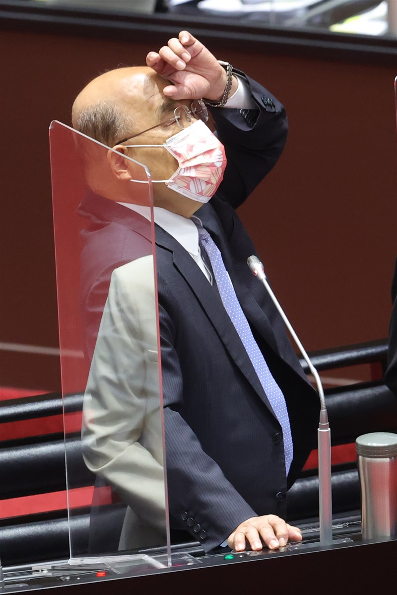 行政院長蘇貞昌快篩呈現陽性,圖為上午在立法院質詢時頻頻摸頭。圖/葉信菉