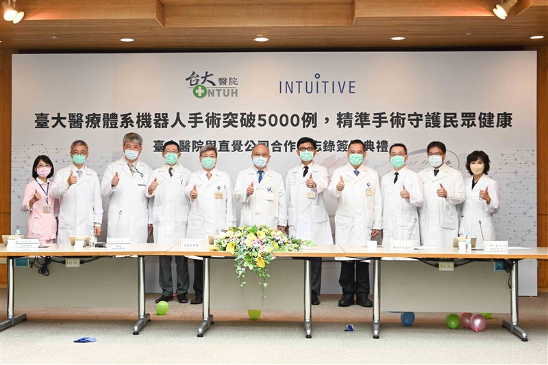 台大醫院今宣布成立國際機器人手術訓練中心及5000例機器手臂手術成果發表,台大醫院院長吳明賢與直覺股份有限公司台灣分公司副總裁暨總經理楊繼盛,簽訂合作備忘錄 (MOU) ,雙方共同合作開拓機器人手術的進一步發展,創造機器人手術訓練中心的新標竿,培育台灣及全球的外科醫師人才,造福更多病患。