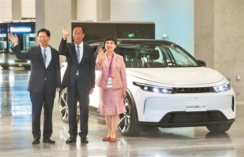 鴻海2022科技日昨天登場,創辦人郭台銘(中)、董事長劉揚偉(左)、裕隆集團執行長黃秋蓮連袂出席活動,他們身後是一部Model C。圖/林俊良