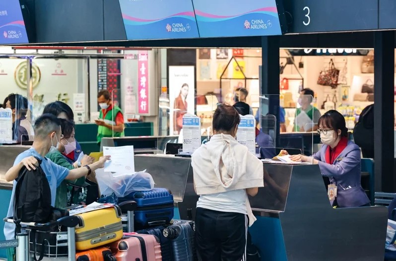 日本政府有鑑於全球疫情持續趨緩的情況,今天調降「傳染病危險情報」到最低的等級「1」。圖為桃園機場出境大廳,旅客在航空公司地勤櫃臺辦理報到手續。圖/資料照片