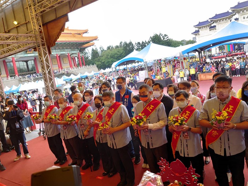【記者曹麗蕙台北報導】「2022台北客家義民嘉年華」,今天(23日)於中正紀念堂兩廳院前藝文廣場舉行,為慶祝活動35周年,全台共有35間宮廟義民爺及忠勇公來到台北,歷時1小時的主祭大典上,透過隆重莊嚴的祭祀古禮,向全國35尊義民爺及忠勇公祈福。