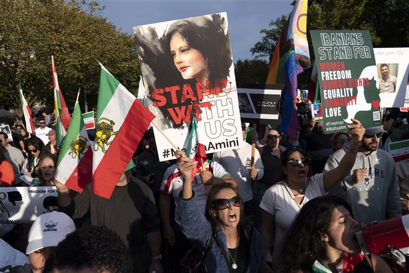 伊朗庫德族女子艾米尼因未戴好頭巾,遭羈押後喪命,引發抗議,華府也有數千人示威。圖/美聯社