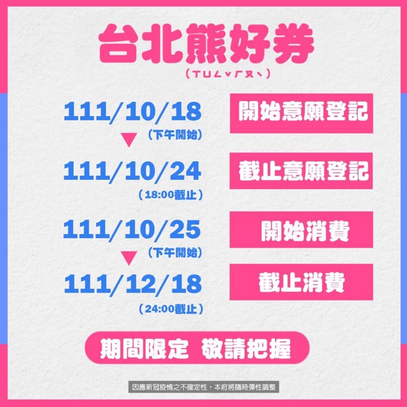 北市熊好券2.0近168萬人登記 今線上抽獎 |2022.10.25 語音朗讀 676觀看次 字級 大 中 小 熊好券2.0於18日開放登記,24日下午6時截止登記,25日上午10時辦理公開線上抽獎。圖/取自台北市政府網頁 【本報台北訊】北市府昨天(24日)宣布,熊好券2.0於10月18日開放登記,截至24日下午6時截止登記,共計167萬7832人完成線上登記,今天上午10時辦理公開線上抽獎。台北市政府表示,熊好券2.0已刷新熊好券1.0第2波的登記總數(156萬1219人),本次登記人數最多的券種分別為饗購券與市集券,最難抽中的券種分別為住宿券與市集券。北市府秘書長陳志銘說,完成登記的民眾可於明天下午打開台北通App查看是否中獎,如有中獎即可持電子票券消費使用,使用期間自111年10月25日至111年12月18日凌晨0時止。圖/取自台北市政府網頁圖/取自台北市政府網頁台北熊好券2.0今天抽籤,這波熊好券2.0一共有167萬7832人完成登記,刷新1.0紀錄,台北市長柯文哲今天主持線上抽籤,由市長柯文哲按下抽球機抽出五顆球,不過抽球機一度出槌,柯文哲抽中五顆亂數種子分別為8、3、8、5、3號。並輸入電腦後,抽出69.6萬的幸運民眾。柯文哲說,民眾最關心的還是抽中什麼時候可以用。這次熊好券2.0有近168萬人來登錄,要抽69.6萬人,對電腦也是大挑戰,抽完籤下午就會發送訊息,民眾只要拿到就可以用,最慢今天晚上就可以使用。北市府表示,先前完成登記的民眾,可於今天下午打開台北通App查看是否中獎,如有中獎即可持電子票券消費使用,使用期間自111年10月25日至111年12月18日凌晨0時止。為了振興經濟,台北市政府斥資5.2億元再發熊好券2.0,北市府表示,這次登記人數最多的券種分別為饗購券與市集券,最難抽中的是住宿券與市集券。其中饗購券中籤率為35%、農好券中籤率30%、運動券中籤路29%、藝文券中籤率13%、市集券中籤率9%、住宿券中籤率5%。 前一篇文章 新聞千里眼 下一篇文章 了解小一生特教服務 新北市6大區連3周辦座談會 熱門新聞 01與精品品牌撞鞋 印度涼鞋打專利戰2025.12.2102佛光山高雄佛教堂 營建工地評鑑特優2025.12.1903太陽瓶燈泡 點亮貧困家庭希望 2025.12.1904邂逅佛教 安頓身心2025.12.2105【時光重逢】花宅海邊美術館2025.12.1906銀杏點亮.東京印象2025.12.2307北島佛光山獲四星肯定 園林躍升具重要意義庭園2025.12.1908【動物奧斯卡獎】猜猜誰最會演(上)2025.12.2109日球星率道奇連霸 2025體壇最驚奇 2025.12.1910社論--瞋恨的危害2025.12.21 訂閱電子報 台北市 天氣預報 台灣一週天氣預報 相關報導 余家昶捨身救人 明年入祀桃園忠烈祠好奇翹翹板 港都新趣處若遇恐怖攻擊 北市擬發細胞簡訊馬太鞍溪橋鋼便橋 元旦提前通行北市隨機攻擊案 警:凶嫌籌畫近2年日月潭落羽松 相映成趣