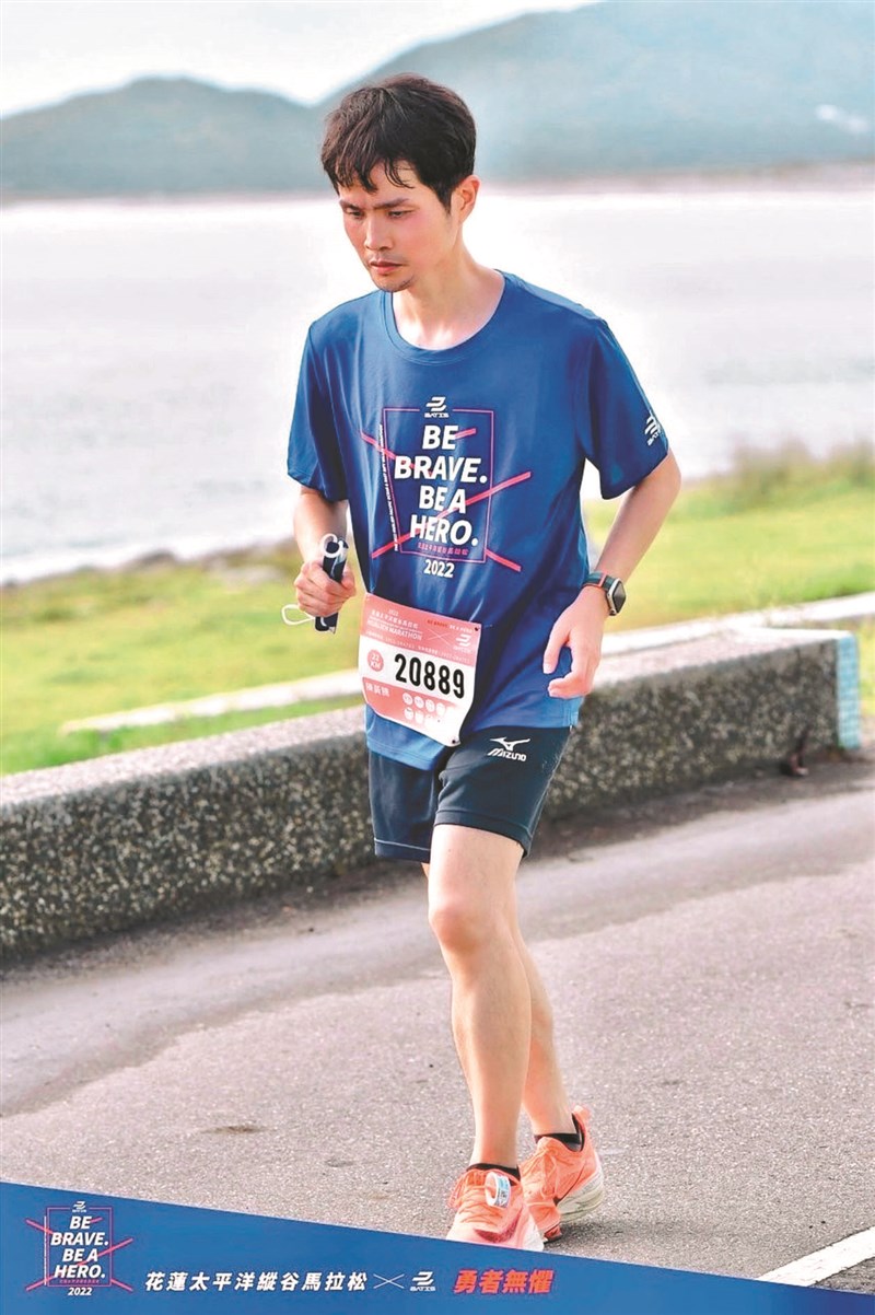 四十一歲陳姓癌友不屈服於病魔,在門諾醫院癌症中心團隊陪伴下,積極慢跑運動並配合治療,上周末參加馬拉松賽。圖/門諾醫院提供