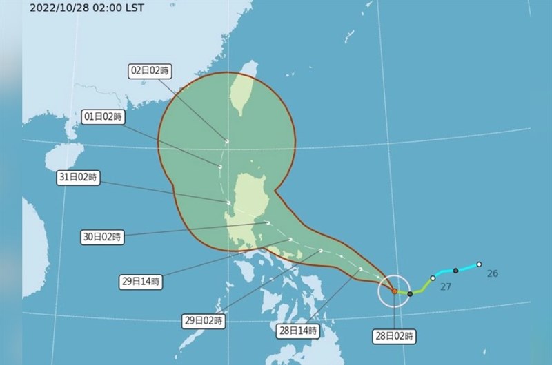 氣象局說,輕度颱風奈格今天(28日)凌晨2時的中心位置在馬尼拉東南東方1020公里海面上,以每小時23公里速度,向西北西進行。