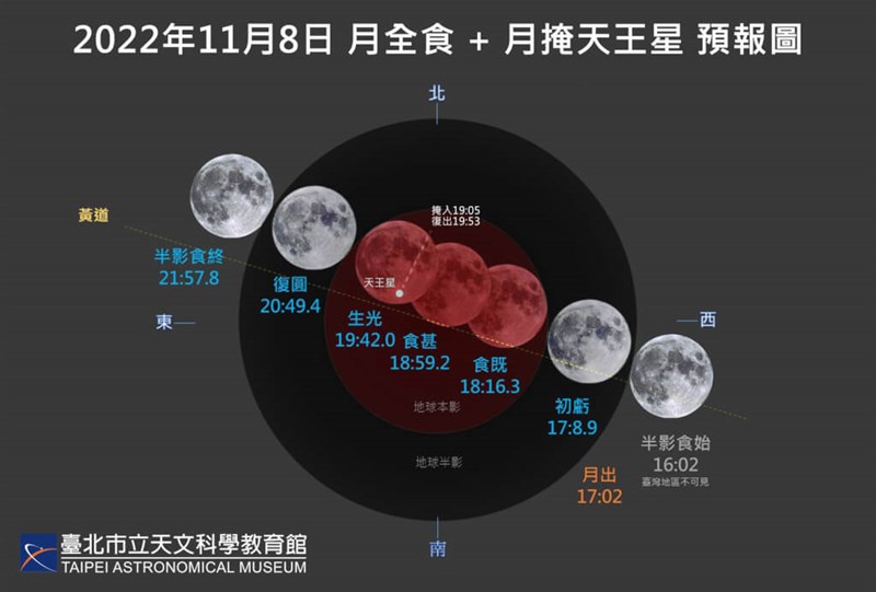 11月8日晚間在台灣、日本、韓國等地可全程目睹月全食,且全食階段又會發生罕見的「月掩天王星」。圖/取自台北市立天文科學教育館網頁tam.gov.taipei