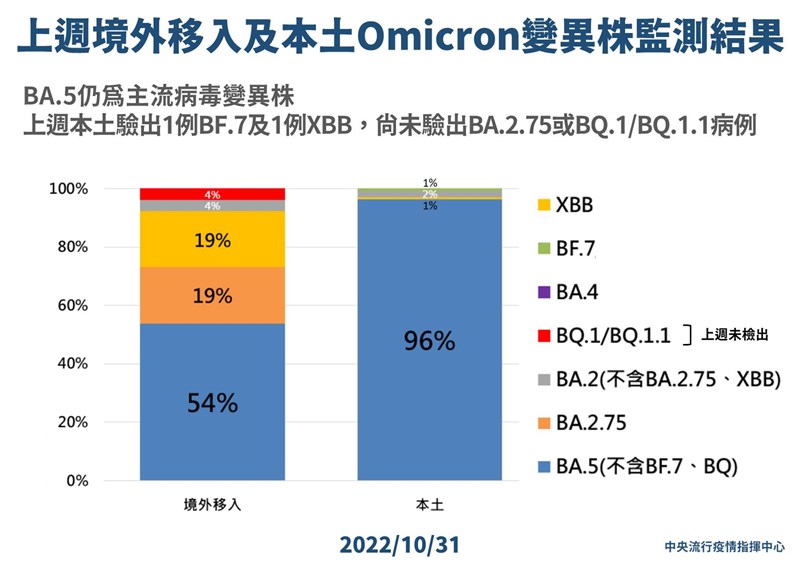 另外,本土個案中也定序出一例XBB個案,為北部40多歲男性,曾接種三劑疫苗,無接觸國外返台人士。個案曾於8月30日確診,10月15日出現發燒、咳嗽、流鼻水等症狀,10月17日再度快篩陽性,就醫經醫師評估為重複感染,通報確診。