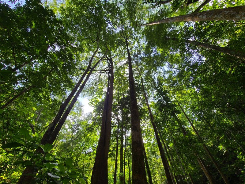 龍腦香科樹種具有高商用價值,林務局引進種植在美濃區,因有木脂油,併同鐵刀木花香吸引蝶鳥棲息。圖/林務局屏東林管處提供