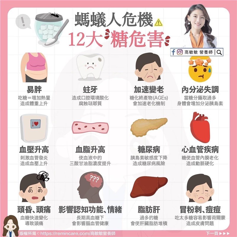 「螞蟻人」不可不知 12種糖危害 陳玲芳 |2022.11.02 語音朗讀 4702觀看次 字級 大 中 小 滿桌精緻甜點,是否讓你食指大動?營養師提醒,常吃甜食除了會「變胖」之外,「糖」還有許多不為人知的危害。圖/pexels 【記者陳玲芳台北報導】你是「嗜甜如命」的「螞蟻人」嗎?雖然也知道吃太多糖,很容易「橫向」發展,但就是無法不將「甜點」列為個人紓解身心壓力的「療癒」聖品。營養師高敏敏說,其實,很多人可能忽略了,常吃甜食除了會「變胖」之外,糖還有許多不為人知的危害。高敏敏歸納、列舉「12種糖危害」如下:1.易胖:吃糖,等於增加熱量,造成體重上升。2.蛀牙:造成口腔環境酸化,腐蝕牙齒琺瑯質。3.加速變老:糖化終產物(AGEs) 會加速老化機制。4.內分泌失調:當糖分攝取過多,身體會增加分泌胰島素。5.血壓升高:刺激血管發炎,造成血壓上升。6.血脂升高:使血液中的三酸甘油脂濃度提升。7.糖尿病:胰島素敏感度下降,造成糖尿病風險。8.心血管疾病:糖使血管內膜老化,造成動脈硬化。9.頭昏、頭痛:血糖快速變化,導致頭痛。10.影響認知功能與情緒:長期高血糖下,會影響腦血管健康。11.脂肪肝:過多的糖,會使肝臟脂肪堆積。12.冒粉刺、痘痘:吃太多糖,容易影響荷爾蒙,造成皮膚問題。圖/高敏敏營養師提供「凡人如我,真的想吃甜的,一天可以吃多少糖?」高敏敏引述衛福部建議,每日飲食中添加精製糖的攝取量,不宜超過總熱量的10%,如果能降至小於5%更好!「那要怎麼計算呢?」高敏敏說,大家可以參考表格,換算自己每天可以吃的糖量。以總熱量1200kcal為例,每日的10%建議糖攝取量為30克;5%建議的糖攝取量則為15克。她指出,一顆方糖約等於5克糖量;而用手搖飲舉例,大家可能更有概念。無糖:0顆方糖,等於0克;3分糖:約3顆方糖,等於15克糖;半糖:約5顆方糖,等於25克糖;7分糖:約7顆方糖,等於35克糖;全糖:約10顆方糖,等於50克糖。(實際仍以每家手搖飲公布的含糖量為準)衛福部國人每日建議糖攝取量為30克;全糖飲料如珍珠奶茶,約含有10顆方糖,亦即50克糖,因此「一杯就超標」。圖/pexels甜食美味 淺嚐即止而「糖」的定義非常多元,蜂蜜、黑糖也是糖,這些糖都要納入每日糖量計算。含糖食物雖然很美味,但只能偶一為之、淺嘗即止,「適量」真的很重要。高敏敏提醒,嗜甜的螞蟻人要多注意,最好能儘量以天然水果(甜度也不宜過高),代替糖果、蛋糕等甜食,用白開水或無糖茶飲,取代含糖飲料。 前一篇文章 不讓視力惡化青暝 糖友不能輕忽5徵兆 下一篇文章 睡到一半痛醒 「心血管痙攣」惹禍 熱門新聞 01【印象旅人】阿里山森鐵首航記2026.04.1102人口持續減少 今年新生兒恐跌破9萬 2026.04.1103螢光花泉季 卡比胖拉超療癒2026.04.1104鄭習會 鄭:兩岸和平制度化2026.04.1105【口腔健康攸關長壽】 張添皓:從齒啟動全身保健2026.04.1106【養眼專欄】 糖尿病為何讓視力忽近忽遠?2026.04.1107洗衣機新過濾系統 捕捉9成微塑膠2026.04.1108MLB太空人打敗洛磯 鄧愷威中繼成功2026.04.1609佛光大佛供奉法華塔與《法華經》信仰意涵2026.04.1210紐約曼哈頓 豆梨花盛開2026.04.11 訂閱電子報 台北市 天氣預報 台灣一週天氣預報 相關報導 母捐肝父捐腎 台大醫院完成罕病童器官移植45%失智症可預防 類黃酮食物護大腦春夏交替 過敏兒噴嚏、搔癢不停脂肪肝成新國民病 減重搭配藥物治療頭髮變脆弱 不當習慣加重掉髮橄欖油可防動脈硬化 留鉀排鈉降低高血壓 作者其他文章【口腔健康攸關長壽】 張添皓:從齒啟動全身保健守護孩子聲命 純音聽力檢查是關鍵清明養生疏肝解鬱 玫瑰花茶調肝降火6神穴舒筋止痛 中醫養生兼抗老助眠把握遠視儲備期 防兒童近視惡化齒列矯正冒黑縫 黑三角真相