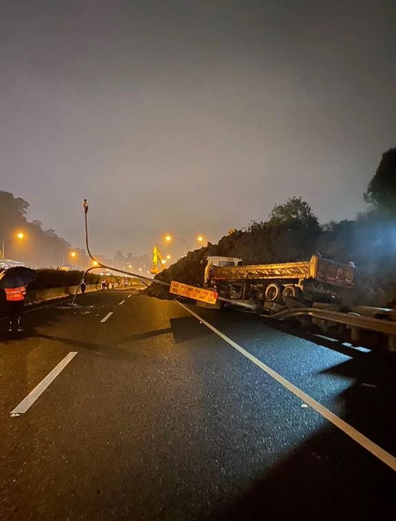 國10.1K原本崩落處,今晚再度塌方,範圍也擴大,不少土石今晚崩落到主線道的一線車道上,路燈也倒下橫在主線道,高公局因此將主線道也封閉,持續搶修中。基隆要南下目前只剩下國3和平面道路可通。