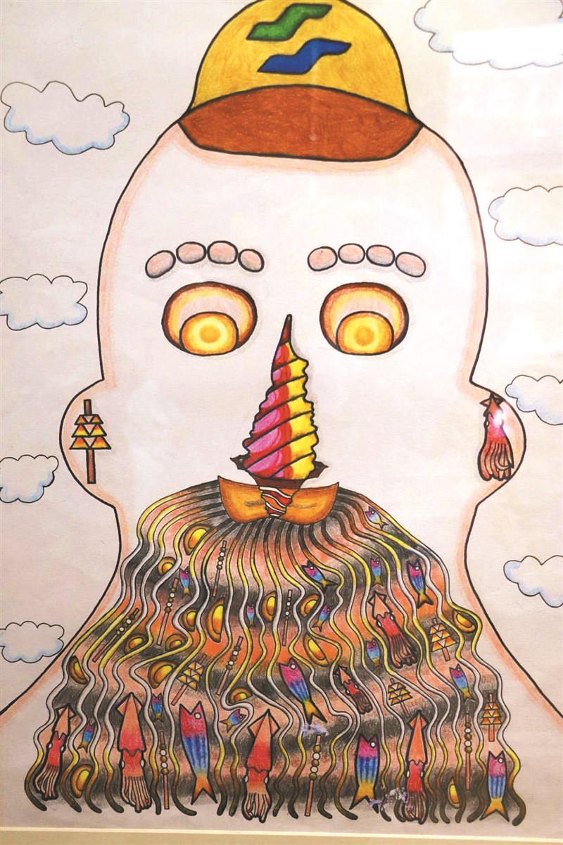 新北淡水旅學堂帶領台灣星奇兒創藝協會的星兒們,了解馬偕博士來台傳教、行醫、興學150周年故事,他們從淡水女學堂出發,沿途體驗馬偕傳教行醫興學之路,再轉化為藝術創作;圖為星兒將馬偕博士的大鬍子畫成粉絲、鼻子變成冰淇淋、嘴巴是阿給,眼睛則為鐵蛋,創作充滿想像力與趣味性。