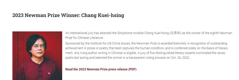 美國紐曼華語⽂學獎公布第8屆得主,由馬來西亞裔台籍作家張貴興獲得。圖/取自紐曼華語文學獎官網