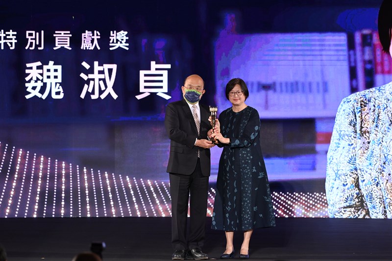 第46屆金鼎獎頒獎典禮今天舉行,行政院院長蘇貞昌(左)頒發「特別貢獻獎」予玉山社出版公司總編輯暨發行人魏淑貞。圖/文化部提供