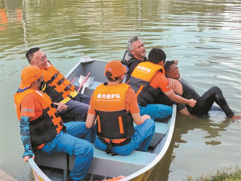 培訓課程安排實戰演練,學習從水中救災民上船的技巧。圖/人間社記者黃俊聞