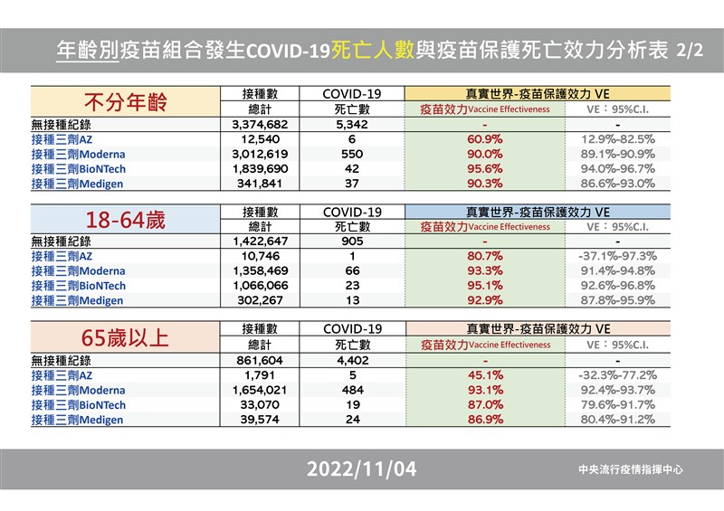 發言人莊人祥表示,針對疫苗保護中重症、死亡的資料分析,是依照2300萬全人口分為不分年齡、18-64歲、65歲以上三個階段,並針對沒有施打疫苗的337萬人,比對施打三劑AZ、三劑莫德納、三劑BNT及三劑高端等,可看出中重症個案數,算出疫苗效益,這是2300萬人的資料放進統計模式中,並根據年齡、性別進行多變相分析,最後做邏輯式分析回歸,最後疫苗效益比較,有打三劑跟沒打三劑的基礎。