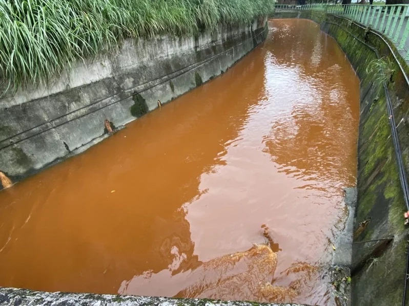 宜蘭縣政府環保局稽查人員10月30日到場時,南門圳呈現紅褐色。圖/宜蘭縣政府環保局提供