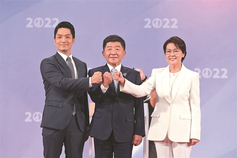 台北市長候選人電視辯論會,國民黨蔣萬安(左)、民進黨陳時中(中)、無黨籍黃珊珊(右)合影。