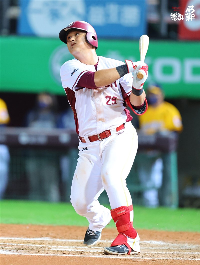 陳俊秀在揮棒時傷到左手腕。圖/樂天桃猿提供