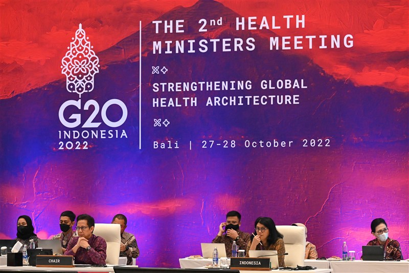印尼總統佐科威表示「強烈感受」普亭將不會出席G20領導人峰會。圖為印尼衛生部長(前左)於10月28日在峇里島的金巴蘭出席G20第2屆衛生部長會議。圖/法新社