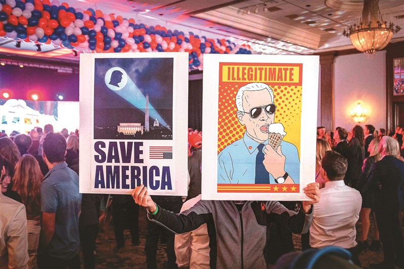 美國期中選舉,兩黨競爭激烈,圖為一位美國亞利桑那州共和黨籍州長候選人雷克支持者,八日手拿嘲諷拜登海報參加選舉之夜。圖/法新社