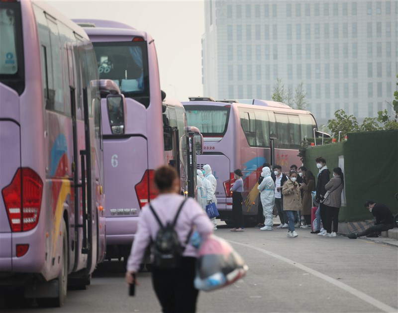 鄭州富士康園區缺工嚴重,圖為10月底搭大巴車離開的員工。圖╱中新社