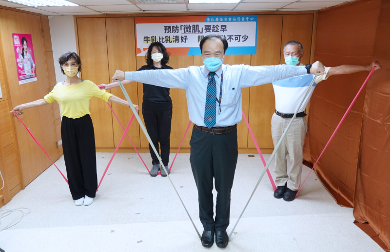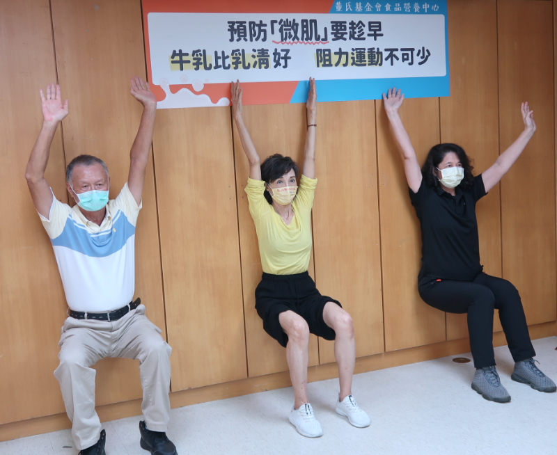 預防「微肌」要趁早,董氏基金會終身義工陳淑麗(中)示範阻力訓練。圖/董氏基金會提供