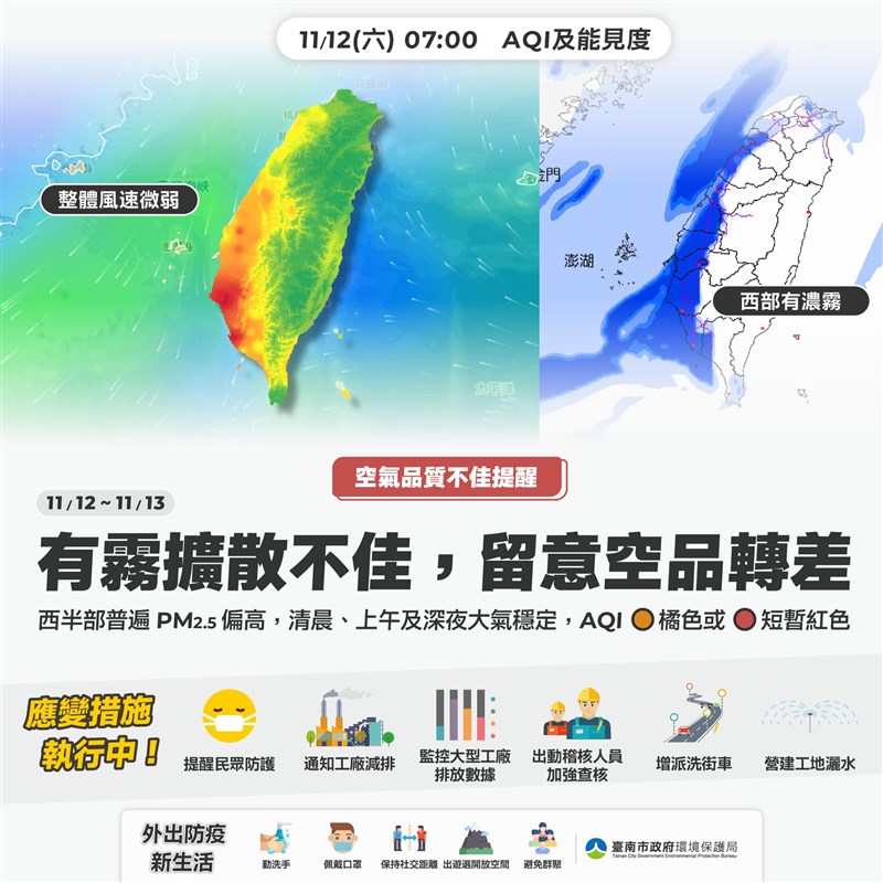 台南空品紅色警示 濃霧特報至下周一 |2022.11.12 語音朗讀 1046觀看次 字級 大 中 小 台南市受濃霧與上風處汙染累積空品惡化,南市成立防制指揮中心應變。圖/環保局提供 【本報台南訊】台南市環保局表示,受到中部汙染物往南移動,加上南台灣整體擴散條件不佳,今日清晨空氣品質不理想。清晨4時台南及安南測站空氣品質為紅色提醒,善化、安南及台南測站為橘色提醒,台南市政府已成立防制指揮中心,透過各項方式盡量減緩空品惡化。中央氣象局也已針對台南市發布濃霧特報,至下周一前天氣型態皆為清晨易有局部濃霧,影響能見度及空氣品質。環保局提醒,每當「有霧、風速弱、大氣擴散條件差」,空品容易不良,尤其清晨、上午時段需注意,若屬敏感族群,請減少早晨在戶外劇烈活動,並做好自我防護。台南市受濃霧與上風處汙染累積空品惡化。圖/環保局提供今(12)日雖是周末假日,市長黃偉哲仍指示市府各局處啟動應變措施,包括環保局加強 44個重點路段共200公里洗街、汙染源管制、通報60家排放大廠和99處大型營建工地,減少排放並加強灑水等措施。環保局呼籲,在空品不佳期間,減少戶外活動,外出應配戴口罩,家中若有敏感族群、幼童及年長者,更需注意健康狀況。市民朋友可以留意環保局空氣品質監測網,環保局每日更新空品狀況,提供即時空氣品質訊息,要注意空品不良時即時更新訊息。台南市受濃霧與上風處汙染累積空品惡化,南市成立防制指揮中心應變。圖/環保局提供 前一篇文章 今明各地熱如夏天 明晚北部有雨 下一篇文章 啟用楠梓足球場 高雄點亮足球夢 熱門新聞 01渥太華佛光山 授海狸童軍領巾2025.11.1702警告日本 陸黃海軍演、籲暫勿遊日 2025.11.1603【詩】遊園地.競馬場2025.11.1704墨西哥熱氣球節 高空爭豔2025.11.1605克林姆富家女肖像畫 估值46億元2025.11.1706芬普尼毒蛋 又爆4萬顆流入市面2025.11.1607【快樂塗鴉簿】熱鬧的內灣小鎮2025.11.1708AMR機器人 是什麼?2025.11.1709落葉刺繡 巴西百鳥寫真集2025.11.1710中日緊張 陸4海警船巡航釣魚台2025.11.17 訂閱電子報 台北市 天氣預報 台灣一週天氣預報 相關報導 三重二二八公園 紫色花瀑優雅垂落北市府新壽解約 輝達落腳北士科定案特富野古道美景 接連獲獎阿里山區 石虎現蹤請病假未逾10日 資方不得不利處分山谷燈光節 下周末開幕