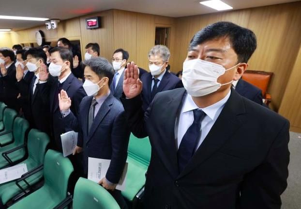 南韓首爾龍山消防署長崔成範(右1)11日,因梨泰院慘案接受市議會質詢。圖/截自韓聯社