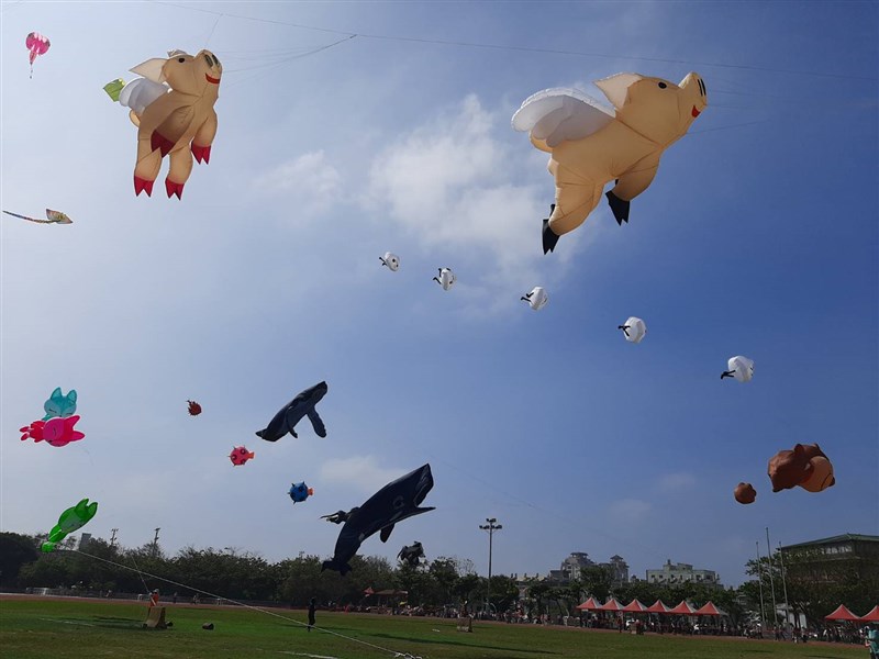 很萌的「 飛豬風箏」與「鯨豚箏霸」,鹿港體育場的天空十分熱鬧。圖╱劉明岩