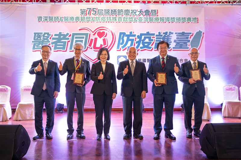 蔡英文總統親臨大會,頒發「111年防疫特殊貢獻獎」予周慶明醫師、邱泰源醫師及洪德仁醫師等3位受獎代表,感謝醫界守護台灣人民生命健康。