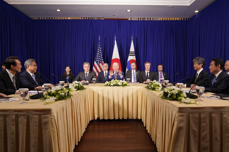 美國、日本及南韓領導人13日在東亞高峰會場邊進行3邊連續會談,3國將更緊密合作因應北韓挑釁,並重申維護台灣海峽和平穩定的重要性。圖/美聯社