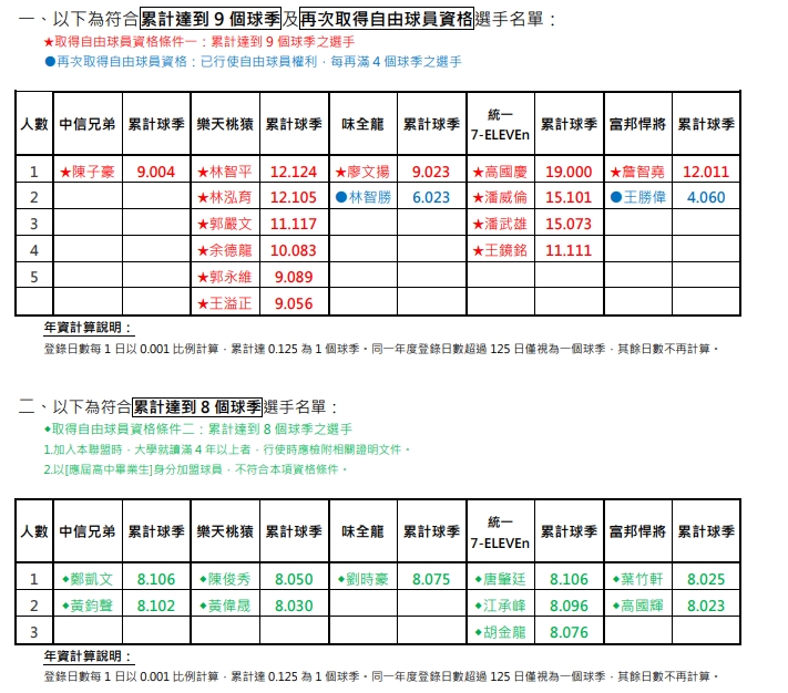 中職/自由球員名單公布 25人符合資格 曾博群 |2022.11.14 語音朗讀 6671觀看次 字級 大 中 小 味全龍隊林智勝取得自由球員資格。圖/味全龍提供 【記者曾博群台北報導】中華職棒今日公布自由球員資格,共有25人符合資格,其中陳子豪、鄭凱文、林泓育季前簽下複數年合約;潘武雄、詹智堯引退,其餘20名選手,需要7個工作天內決定是否「宣告自由」。根據中職規章規範,在一軍登錄滿9年,或大學就讀滿4年以上投入職棒者一軍登錄滿8年者,可取得自由球員資格,前一次行使滿4年者也可再次取得,符合者需於7個工作天內向球團表達意願並行文聯盟,才算完成行使自由球員權利。滿9年包括中信兄弟隊陳子豪、猿隊林智平、林泓育、郭嚴文、余德龍、郭永維、王溢正;味全龍隊廖文揚、林智勝;統一獅隊高國慶、潘威倫、潘武雄、王鏡銘,以及富邦悍將隊詹智堯、王勝偉。滿8年則有兄弟鄭凱文、黃鈞聲、猿隊陳俊秀、黃偉晟、龍隊劉時豪、獅隊唐肇廷、江承峰、胡金龍、悍將隊葉竹軒、高國輝。以上球員若要行使FA權利,必須提出大學讀滿4年的文憑證明。今年首度採取A級、B級二個層級,有不同的轉隊費方案。聯盟表示,陳子豪、鄭凱文、林泓育、郭嚴文、王溢正、陳俊秀、廖文揚、林智勝、高國慶、潘威倫、潘武雄、王鏡銘、高國輝符合A級自由球員資格;其餘選手則為B級。A級選手的轉隊補償辦法,有轉隊費年薪125%、或轉隊費年薪75%加1名補償球員,B級球員只有一種方案是轉隊費年薪75%。中職公布自由球員名單。圖/中職提供 前一篇文章 中職/正式取得本土球員資格 羅力成為中職第一人 下一篇文章 小番茄瘋欉與氣候異常有關 農委會列現金救助 熱門新聞 01全中運張雅佳游泳 3 金 雙破全國2026.04.2402【走讀城鄉】淡水市街清代三合院─施家古厝2026.04.2403衣服晾乾變硬 微觀祕密 2026.04.2204永和學舍慶佛誕 千人浴佛清淨身心2026.04.22052026地球日 行動永續綠色未來 2026.04.2206【詩】諸羅山社2026.04.2407駐巴拉圭大使 參訪巴拉圭佛光山2026.04.2308白宮宗教會議 佛光山參與跨宗教對話2026.04.2209普門寺43周年紀念 千人朝山修持2026.04.2310台南.佳里 蕭壠香火溯根源 紅磚古厝映流年2026.04.27 訂閱電子報 台北市 天氣預報 台灣一週天氣預報 相關報導 游盈隆就職 誓打造公正客觀中選會台61南延高雄拍板 安平港2路線送評估林佳龍任總統特使 抵史瓦帝尼看電影、聽演唱會 免課娛樂稅美太空人林琪兒 重返兒時舊居地第18屆兩湖論壇 南投登場 作者其他文章世世動了心 陸平台3天破500萬觀看台師大參照古籍 重建600年颱風史台首創AI步行機器人 加速中風患者復健肌少症非銀髮族獨有 研究籲篩檢提前至50歲林惠理2萬葉材築葉語 永續呈現大地語言華文文學星雲獎 隱地獲貢獻獎