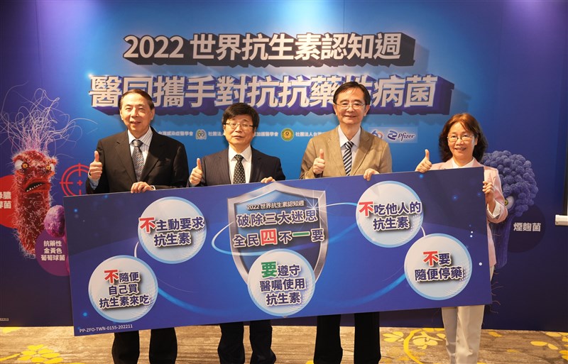 2022世界抗生素認知周,醫同攜手對抗抗藥性病菌記者會,左起台灣胸腔暨重症加護醫學會王鶴健理事長、衛福部疾病管制署周志浩署長、台灣感染症醫學會王復德理事長、台灣感染管制學會陳宜君理事長。圖/記者陳玲芳