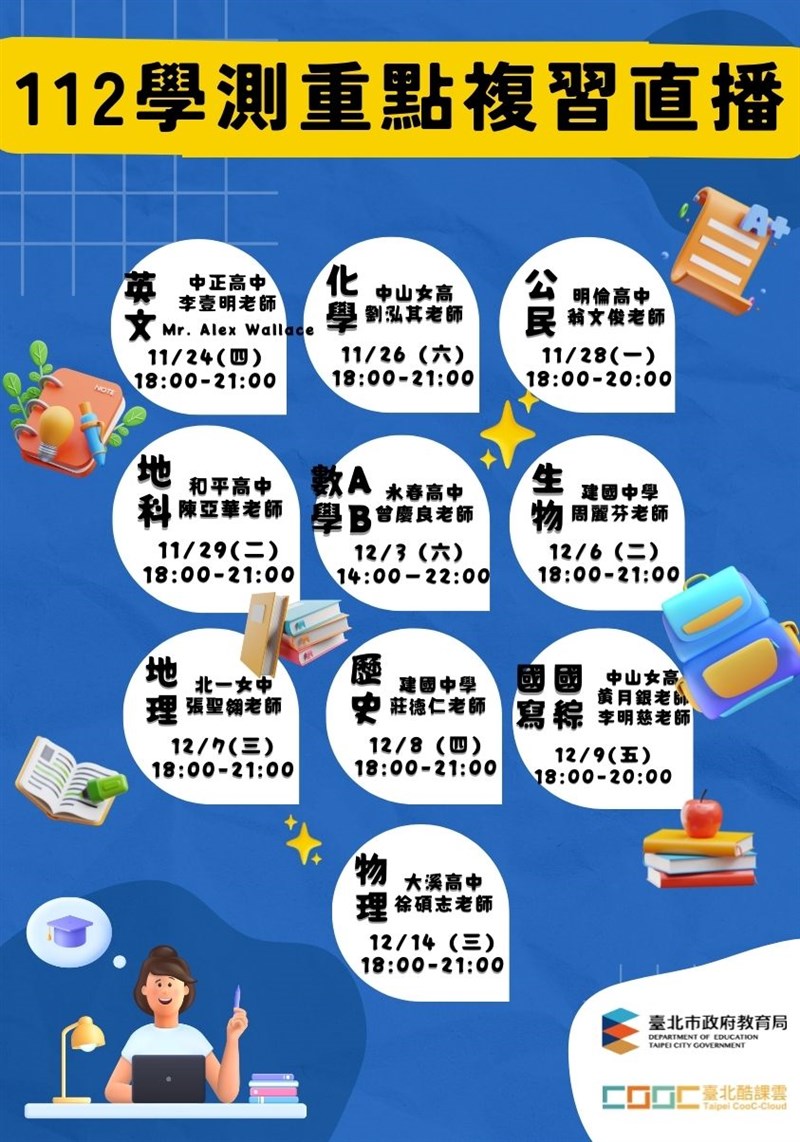 【記者曾博群台北報導】112年學測即將進入倒數階段,台北酷課雲持續推出「112年學科能力測驗考前複習直播課程」,陪伴考生預測考題趨勢、精準抓題。自11月24日至12月14日平日晚間與周末時間,邀請北市名師群線上講授英文、數學、生物、地理等全科目考前重點及解題策略,並開放與線上教師即時問答互動。