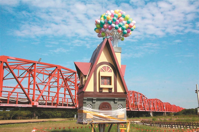【記者江俊亮雲林報導】西螺大橋曾有「遠東第一長虹」的美譽,自從卸下運輸要務後,轉型為觀光大橋,橋下灘地「蝴蝶公園」最近新增八座裝置藝術,其中電影動畫《天外奇蹟》的飛天屋,最受矚目。