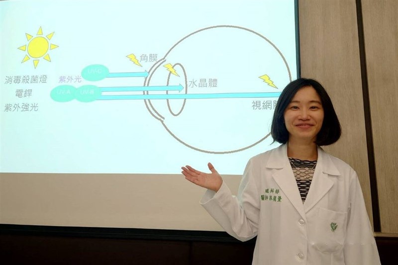 奇美醫學中心眼科部主治醫師林育萱(圖)18日在院內衛教宣導會表示,近年因消毒殺菌燈造成的光照性角結膜炎個案有增加趨勢,使用時應注意防護。圖/中央社