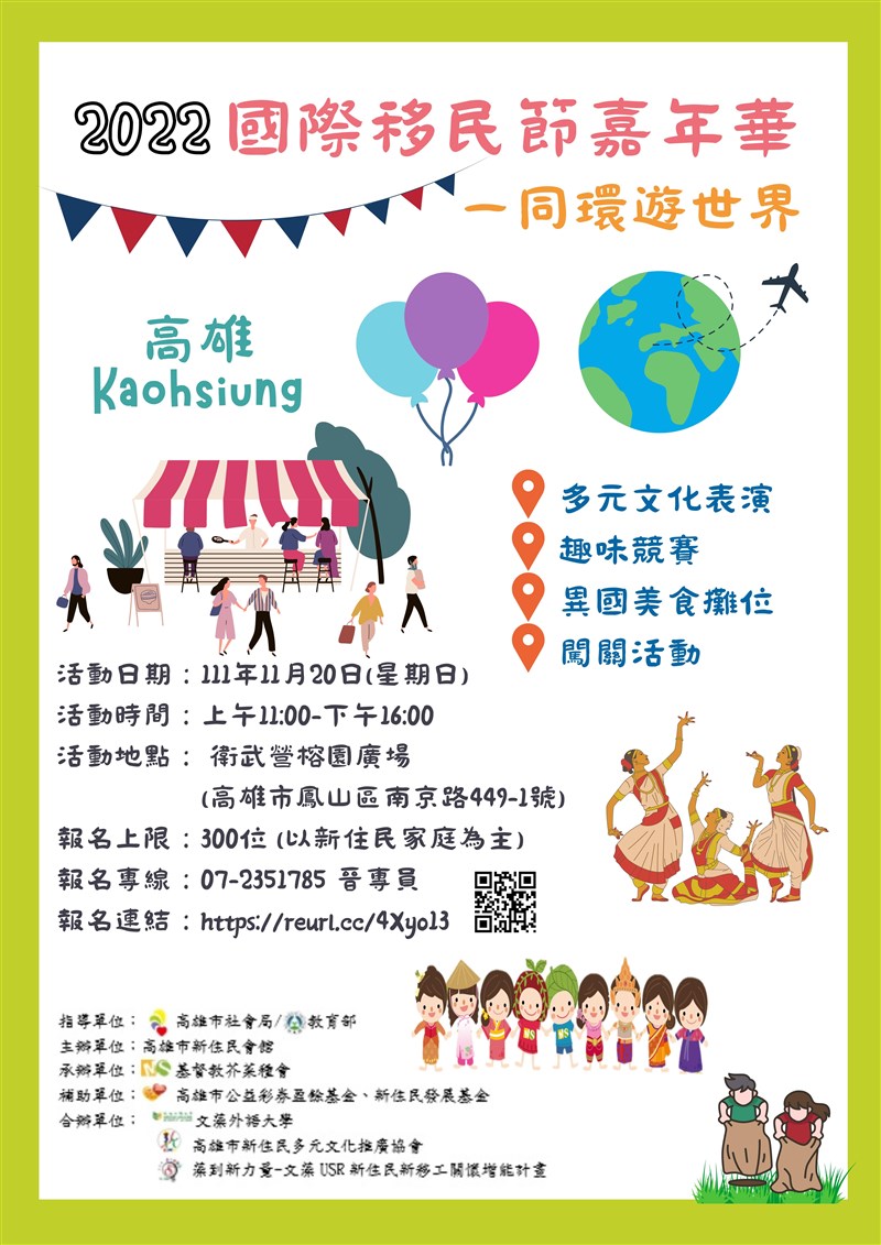 疫情改變大家的生活,在台新住民也飽受思鄉之苦,高雄市新住民人數為全台第二高,隨新冠疫情降溫,活動逐漸復甦,高雄市2022國際移民節嘉年華將在本周日登場,有逾300名新住民報名參與,反應十分熱烈。當天開幕式有來自印尼、馬來西亞和土耳其等10個團隊,配合各國音樂,穿著國服快閃出場,活動現場設置近40個攤位,主辦單位也安排踩高蹺、袋鼠跳趣味競賽炒熱氣氛。