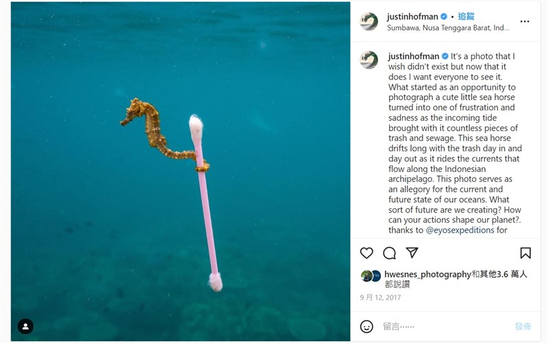 【本報綜合報導】隨著極端氣候不斷出現,加上大量的人為破壞,自然環境正受到前所未有的傷害。根據國外媒體The Dodo的報導,野生動物暨海洋生物攝影師霍夫曼(Justin Hofman)日前拍下了一張小海馬勾住一根棉花棒游泳的照片,引起了國際關注,但他卻悲傷直言:「這是一張我不希望它存在的照片」。