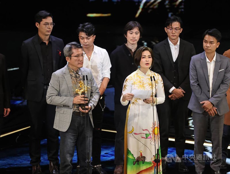 第59屆金馬獎頒獎典禮19日晚間在台北國父紀念館登場,最佳紀錄片獎由蔡崇隆(前左)執導的「九槍」獲得。圖/中央社