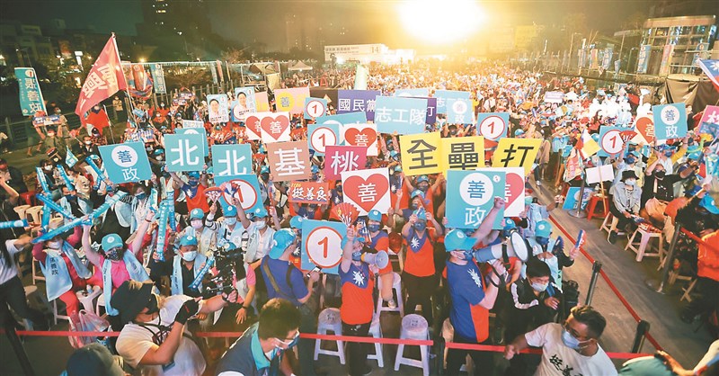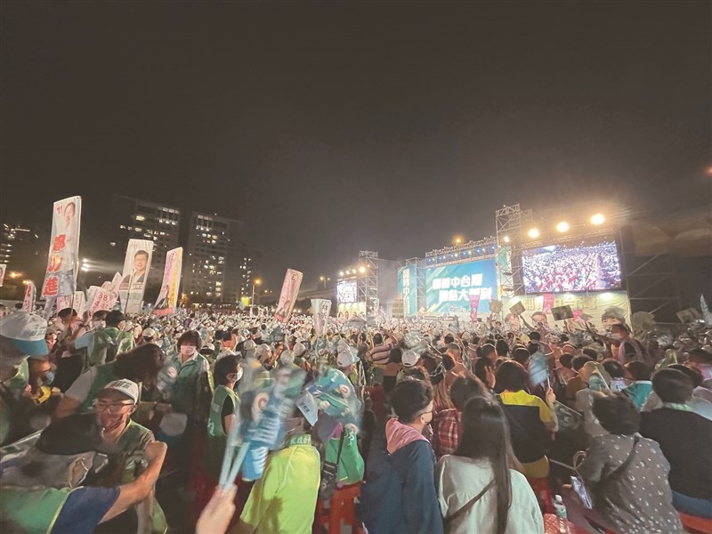 民進黨則是中彰投苗四縣市長候選人齊聚台中北屯,舉辦「翻轉大台中、團結大勝利」聯合造勢晚會,蔡英文總統、副總統賴清德、行政院長蘇貞昌現身力挺,湧入超過兩萬人搖旗吶喊、「凍蒜」聲此起彼落,外圍仍有大批民眾堵在入口,周圍停滿大型遊覽車、小型車、機車等,一度導致周邊大塞車。