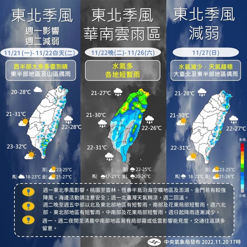中央氣象局預報員葉致均表示,明天天氣與今天相似,因東北季風影響,東半部、西半部山區有局部短暫雨、氣溫偏涼;22日上半天是空檔,東北季風稍減弱,北部回溫有感,但22日晚間起又有一波東北季風再增強。