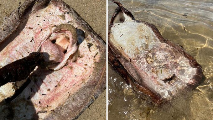 照片在網路上引起熱議,從照片中可明顯看出這個生物已死亡,身體蜷縮在一起,模樣相當詭異,不少網友猜測這應該是會放電的海洋生物「棺材鰩(Coffin ray)」。