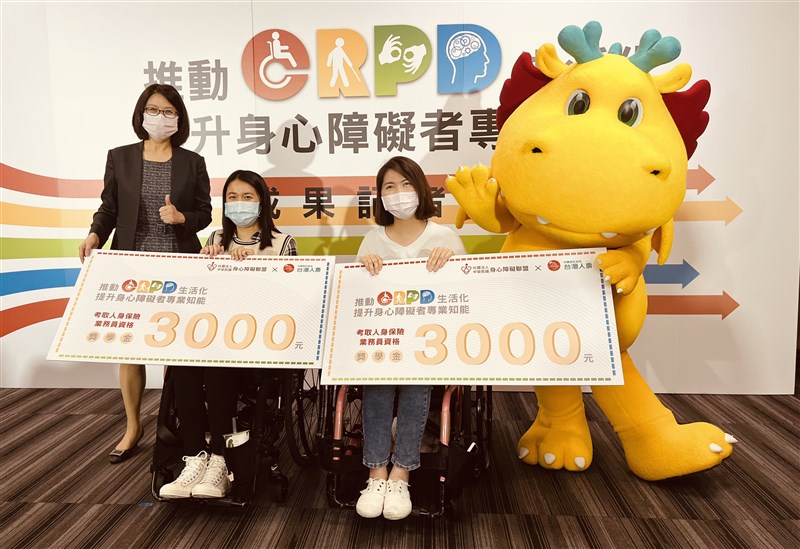 台灣人壽為身障朋友打造專屬金融保險課程,並提供獎學金,鼓勵報考壽險業務員證照。自左至右,依序為台灣人壽副總經理楊欣枬,考取證照的稚莠、家羽。圖/記者陳玲芳