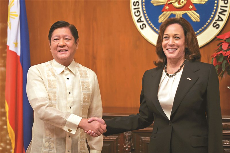 美國副總統賀錦麗(右)抵菲訪問,二十一日與菲國總統小馬可仕(左)會面。圖/中央社