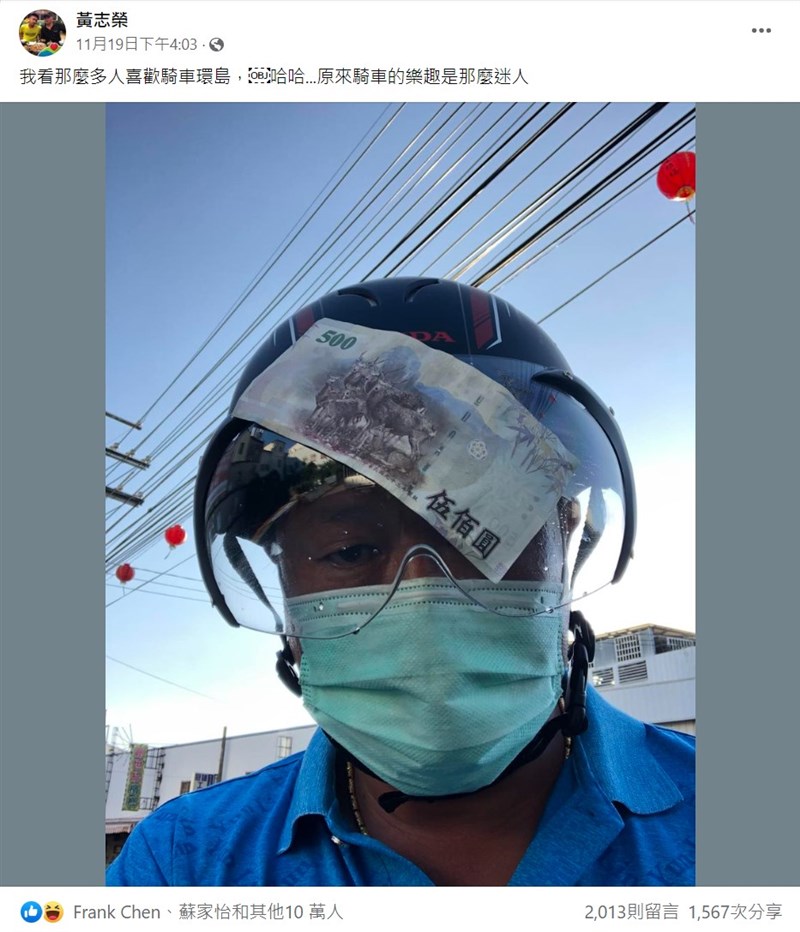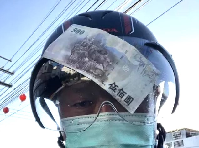 【本報綜合報導】日前一名騎士在臉書社團「騎車環島趣」上貼出一張照片,可見照片中騎士的安全帽上貼著一張500元大鈔,這位騎士表示「我看那麼多人喜歡騎車環島,哈…原來騎車的樂趣是那麼迷人」,原來是這名騎士在騎車環島的途中,被空中飛來的500元大鈔,給打中安全帽的護目鏡了!
