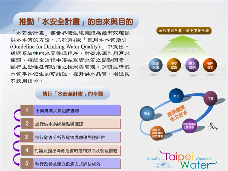 台水今天發布新聞稿表示,自107年起導入世界衛生組織(WHO)所公布的水安全計畫(Water Safety Plan, WSP)管理架構,主要精神從水源至用戶端,各環節進行綜合性風險評估與風險管理,有效控管汙染風險及危害,確保自來水符合飲用水法規及民眾用水安全。