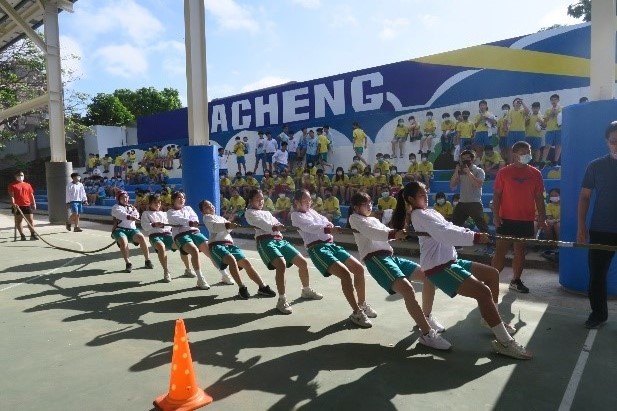 大成國中辦理班際拔河比賽,體育課融入品德教育,以凝聚班級向心力。圖/教育局提供